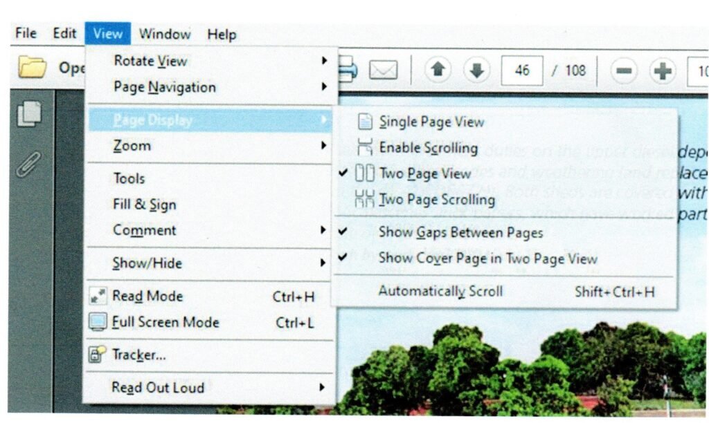 Directions to allow a single-page PDF to be viewed in double-page mode – to allow a centre-page spread, or any other spread, to be seen in full.